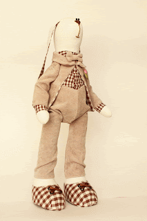 В комплект к зайке Дунечке сшился Степан, парень очень серьезный, сшит из хлопка, одежда хлопковый микровельвет. Сшился Степан на одном дыхании, как и Дунечка, может потому,  что они первые, а может  потому, что очень увлекло меня это занятие. И ко второму пункту я склоняюсь больше. Ведь это такой увлекательный процесс – придумывание образа, а потом его воплощение. В качестве аксессуара планировалось пасхальное яичко в технике декупаж, но как-то не сложилось у меня с этой техникой, и Степан остался в том виде, в каком он есть сейчас. Но мне, почему то кажется, что это его совсем не портит.